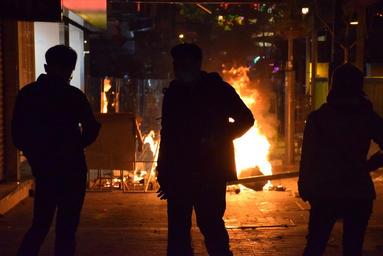 Keywords: 2016 Mong Kok civil unrest fire Barrier.jpg zh 示威 利用火堆及 礙物興警察對峙 http //www voacantonese com/content/hk-lunar-new-year-fish-ball-protests-clash-with-police-live-qand-a-20160209/3183142 html Iris Tong 2016-02-09 PD-USGov-VOA 2016 Mong Kok civil unrest