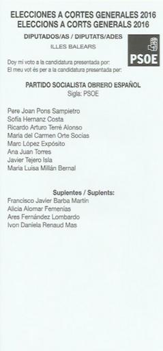 Keywords: 2016 Spanish General Elections Ballot - Illes Balears - Partido Socialista Obrero Español (PSOE).png es Papeleta electoral de Partido Socialista Obrero Español PSOE para el Congreso - Elecciones Generales de España de 2016 circunscripción de Illes Balears 2016-06-26 own JulianVillodre other versions cc-zero PD-SpanishGov <br/> De minimis The party logo Ballot papers for the 2016 general election for the Balearic Islands Ballot papers for the 2016 Spain general election supported by Wikimedia España All medias supported by Wikimedia España in 2016 Ballot papers for Partido Socialista Obrero Español Uploaded via Campaign bpsge |