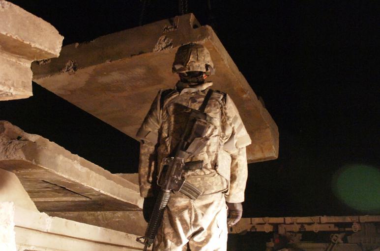 | Keywords: 20,000 barriers into Baghdad DVIDS115411.jpg en Weston Colo native Staff Sgt Jon Waldron of the 15th Transportation Company 165th Combat Sustainment Support Battalion 1st Sustainment Brigade guides a barrier into place at Joint Security Station Ur a barrier holding yard in Sadr City Barriers such as this one are being used all over Baghdad to build solid walls of reinforced concrete that serve to deter improvised explosive device attacks and cut off enemy escape routes 2008-09-15 Sgt Aaron Leblanc https //www dvidshub net/image/115411 115411 2008-09-15 09 17 CAMP TAJI IQ PD-USGov Camp Taji Images from DoD uploaded by Fæ |