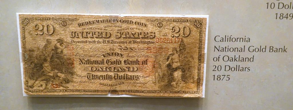 Keywords: 20 Dollars, National Gold Bank of Oakland, California, 1875 - National Museum of American History - DSC00211.jpg en Exhibit in the National Museum of American History Washington DC USA Photography was permitted in the museum without restriction 2015-03-27 11 31 11 own Daderot other versions cc-zero Banknotes in the National Museum of American History Local currencies of the United States |