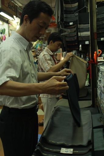Keywords: Ba và bác gấp vải thành từng miếng dài hình chữ nhật đều tăm tắp.