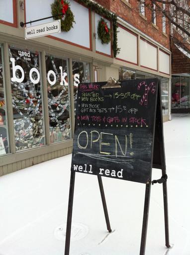 Keywords: winter snow bookstore sidewalksign wellread brickdistrict