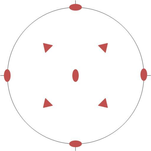 | Keywords: 23 point group.png en Stereographic representation of the symmetry point group 23 The 001 direction is perpendicular to the projection plane The rotation axes are represented in red The thin black ticks show the direction of the equivalent crystallographic axes a and b fr Représentation stéréographique du groupe ponctuel de symétrie 23 La direction 001 est perpendiculaire au plan de projection Les axes de rotation sont représentés en rouge Les trait fins noirs montrent la direction des axes cristallographiques équivalents a et b own Perditax 2011-06-06 Cc-zero Point groups |