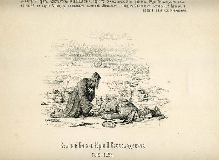 Keywords: 27 History of the Russian state in the image of its sovereign rulers.jpg ru Великий Князь Ю ий II Всеволодович 1219-1238 г <br>По сме ти б ата Константина Всеволодовича ве нул великокняжеский п естол Ю ий Всеволодович пал на бе егу Сити п и вто ичном нашествии онголов и найден Епископом Ростовским Ки иллом в куче тел обезглавленним full 27 History of the Russian state in the image of its sovereign rulers - fragment jpg Mongol invasion of Rus History of Yaroslavl Oblast Yuri II of Vladimir in engravings Yaroslavl Oblast in art Diocesan bishops of Rostov and Yaroslavl