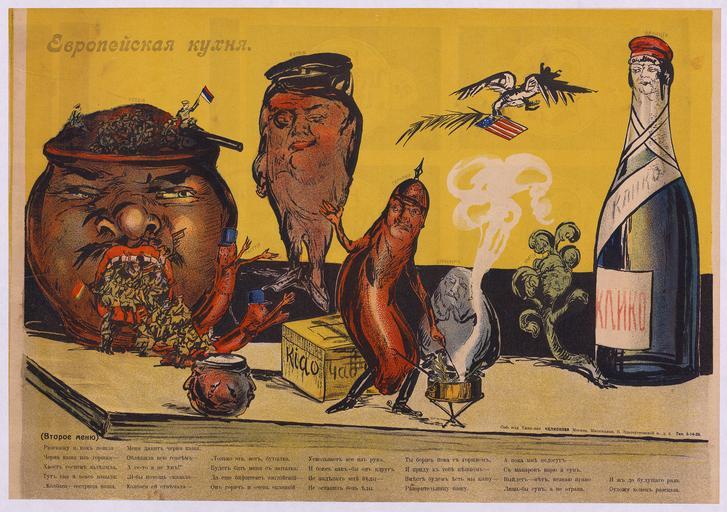 | Keywords: 28-2 Sammlung Eybl Европейская кухня (Europäische Küche). 1914. 36 x 51 cm. (Slg.Nr.273).jpg Russland Alexander Apsit 1880-1943 Ев опейская кухня Europäische Küche 1914 36 x 51 cm Slg Nr 272 273 Fortsetzung des ersten Bildes Der russische Brei quillt aus dem Topf und klebt die österreichischen Würstchen am Boden fest Sie rufen die deutsche Wurst zu Hilfe doch die ist gerade damit beschäftigt die italienischen Makkaroni einzukochen und steht selbst unter Beobachtung des Champagners und des Roast Beefs Neu im Bild Der amerikanische Vogel mit dem Palmzweig des Friedensstifters Russia Alexander Apsit 1880-1943 Ев опейская кухня European kitchen 1914 36 x 51 cm Slg Nr 272 273 The Russian pulp swells out of the pot and sticks firmly the Austrian sausages on the ground Call the German sausage to help but they are just busy to cook the Italian Macaroni and is even under observation of champagne and Roast Beefs New Image The American Bird with the palm of peacemaker Sammlung Eybl Plakatmuseum Wien 2015-09-17 10 29 12 A Erhardt Credit line Eybl Plakatmuseum Wien/Wikimedia Commons CC-BY-SA-4 0 wiki Sammlung Eybl Plakatmuseum Wien PD-old World War I posters of Russia Plakatmuseum Wien Eybl Collection Quality images by Hubertl QualityImage |