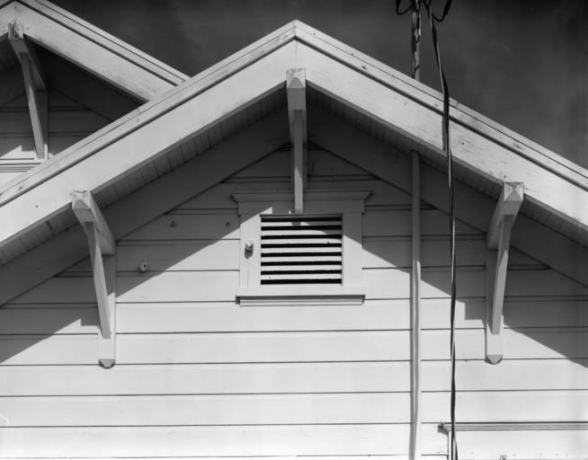 | Keywords: 2984 Misty Street - detail of eave - Chemawa Indian School - Salem Oregon.jpg  brackets wood siding ” Chemawa Indian School 2984 Misty Street Salem Marion County Oregon Built 1923; demolished 1978 Former National Register of Historic Places listing 1977 photograph from the HABS ”Historic American Buildings Survey images of Oregon - ;Credits Steve Vaile photographer CALL NUMBER HABS ORE 24-SAL 1I- CREATOR Historic American Buildings Survey creator NOTE Survey number HABS OR-129-I DIGID http //hdl loc gov/loc pnp/hhh or0048 LOC card Frame with novelty siding rectangular with rear extension 26' three-bay front x 30' one story gable roof with exposed rafters and purlins forming brackets two-bay gable-roof entrance porch with square columns and baluastrade Built 1920-21; demolished 1978 4 ext photos 1977 Also see Chemwa Indian School OR-129 Card prepared 1979 Library of Congress Steve Viale 1977 OR-129-L Historic American Buildings Survey photographs of the Chemawa Indian School Brackets architecture Chemawa Sidings Chemawa Bungalows in Oregon ~ Former buildings in Oregon ~ 1977 in Oregon Chemawa Black and white photographs of Oregon Chemawa |
