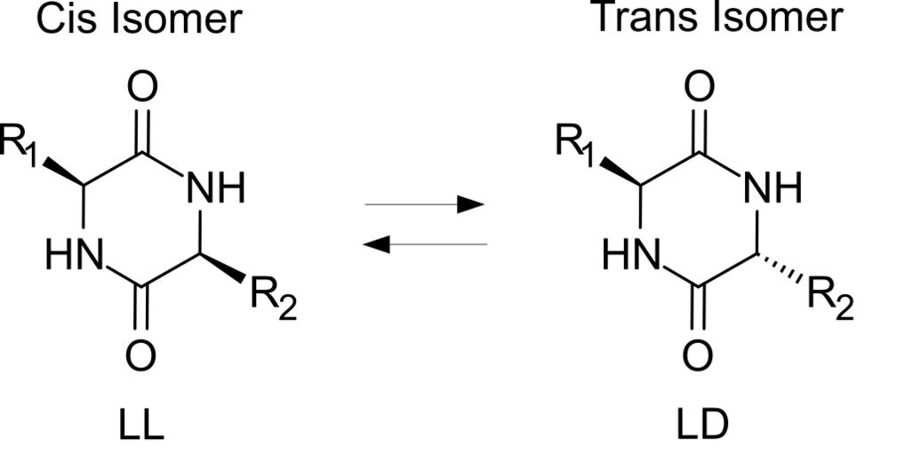 Keywords: 2,5 DKPs Cis and Trans isomers.svg en Cis and Trans isomers of 2 5-dketopiperazines 2016-04-24 own Alandb other versions cc-zero Diketopiperazines