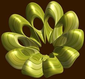 Keywords: mathematica 3d cg parametricplot3d texture torus 輪環 りんかん ドーナツ どーなつ 五芒星 ごぼうせい 五光星 ごこうせい 五稜星 ごりょうせい code program algorithm コード プログラム アルゴリズム pentagram geometric sculpture geometricsculpture shape geometry sculpture mapping テクスチャ マッピング 模様 もよう abstract 抽象 ちゅうしょう アブストラクト design pattern デザイン パターン graphic グラフィック グラフィクス structure 意匠 構造 symmetry 対称性 たいしょうせい シンメトリー 対称 たいしょう algorithm コード indoor black background a = 3; (* center hole size *) b = 5; (* penta-torus *) c = 0; (* distance from the center of rotation *) d = 2; (* number of torus *) h = 2; (* height of a torus *) SetOptions[ParametricPlot3D, PlotRange -> Full, Mesh -> None, Boxed -> False, Axes -> False, PlotPoints -> 400, ImageSize -> 3000, Background -> Darker[Orange, 0.8], PlotStyle -> Directive[Specularity[White, 30], Texture[Import["D:/tmp/71.jpg"]]], TextureCoordinateFunction -> ({#4 + #5, #5 / Pi} &), Lighting -> "Neutral"]; f[v_] := Sin[2 Sin[Sin[Sin[v]]]]; x = (a - Cos[t] - f[b s]) Cos[s]; y = (a - Cos[t] - f[b s]) Sin[s]; z = (a - Sin[t] - h Sin[b s]) + c; rot = Table[{x, y, z}.RotationMatrix[2 i Pi/d, {0, 0, 1}], {i, d}]; ParametricPlot3D[rot, {t, 0, 2 Pi}, {s, 0, 2 Pi}] (*--- The Texture is this: www.flickr.com/photos/tanaka_juuyoh/5239255695/ *) a = 3; (* center hole size *) b = 5; (* penta-torus *) c = 0; (* distance from the center of rotation *) d = 2; (* number of torus *) h = 2; (* height of a torus *) SetOptions[ParametricPlot3D, PlotRange -> Full, Mesh -> None, Boxed -> False, Axes -> False, PlotPoints -> 400, ImageSize -> 3000, Background -> Darker[Orange, 0.8], PlotStyle -> Directive[Specularity[White, 30], Texture[Import["D:/tmp/71.jpg"]]], TextureCoordinateFunction -> ({#4 + #5, #5 / Pi} &), Lighting -> "Neutral"]; f[v_] := Sin[2 Sin[Sin[Sin[v]]]]; x = (a - Cos[t] - f[b s]) Cos[s]; y = (a - Cos[t] - f[b s]) Sin[s]; z = (a - Sin[t] - h Sin[b s]) + c; rot = Table[{x, y, z}.RotationMatrix[2 i Pi/d, {0, 0, 1}], {i, d}]; ParametricPlot3D[rot, {t, 0, 2 Pi}, {s, 0, 2 Pi}] (*--- The Texture is this: www.flickr.com/photos/tanaka_juuyoh/5239255695/ *) |