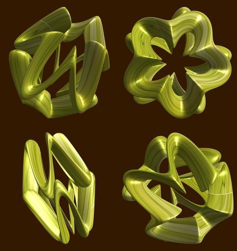 | Keywords: mathematica 3d cg parametricplot3d texture torus 輪環 りんかん ドーナツ どーなつ 五芒星 ごぼうせい 五光星 ごこうせい 五稜星 ごりょうせい code program algorithm コード プログラム アルゴリズム pentagram geometric sculpture geometricsculpture shape geometry sculpture mapping テクスチャ マッピング 模様 もよう abstract 抽象 ちゅうしょう アブストラクト design pattern デザイン パターン graphic グラフィック グラフィクス structure 意匠 構造 symmetry 対称性 たいしょうせい シンメトリー 対称 たいしょう algorithm コード plant foliage leaf black background organic pattern a = 3; (* center hole size *) b = 5; (* penta-torus *) c = -6; (* distance from the center of rotation *) d = 2; (* number of torus *) h = 3; (* height of a torus *) SetOptions[ParametricPlot3D, PlotRange -> Full, Mesh -> None, Boxed -> False, Axes -> False, PlotPoints -> 400, ImageSize -> 1600, Background -> Darker[Orange, 0.8], PlotStyle -> Directive[Specularity[White, 30], Texture[Import["D:/tmp/71.jpg"]]], TextureCoordinateFunction -> ({#4 + #5, #5 / Pi} &), Lighting -> "Neutral"]; x = (a - Cos[t] - Sin[b s]) Cos[s]; y = (a - Cos[t] - Sin[b s]) Sin[s]; z = (a - Sin[t] - h Sin[b s]) + c; rot = Table[{x, y, z}.RotationMatrix[2 i Pi/d, {1, 1, 0}], {i, d}]; ParametricPlot3D[rot, {t, 0, 2 Pi}, {s, 0, 2 Pi}] (*--- The Texture is this: www.flickr.com/photos/tanaka_juuyoh/5239255695/ *) a = 3; (* center hole size *) b = 5; (* penta-torus *) c = -6; (* distance from the center of rotation *) d = 2; (* number of torus *) h = 3; (* height of a torus *) SetOptions[ParametricPlot3D, PlotRange -> Full, Mesh -> None, Boxed -> False, Axes -> False, PlotPoints -> 400, ImageSize -> 1600, Background -> Darker[Orange, 0.8], PlotStyle -> Directive[Specularity[White, 30], Texture[Import["D:/tmp/71.jpg"]]], TextureCoordinateFunction -> ({#4 + #5, #5 / Pi} &), Lighting -> "Neutral"]; x = (a - Cos[t] - Sin[b s]) Cos[s]; y = (a - Cos[t] - Sin[b s]) Sin[s]; z = (a - Sin[t] - h Sin[b s]) + c; rot = Table[{x, y, z}.RotationMatrix[2 i Pi/d, {1, 1, 0}], {i, d}]; ParametricPlot3D[rot, {t, 0, 2 Pi}, {s, 0, 2 Pi}] (*--- The Texture is this: www.flickr.com/photos/tanaka_juuyoh/5239255695/ *) |