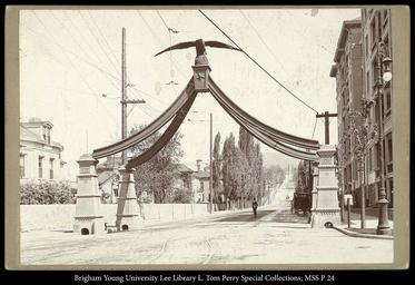 Keywords: 309 MSS P 24 B2 F13.jpg depicted people depicted place Salt Lake City Utah other date circa 1890 1900 Collodion Cabinet- 4 1/4 x 6 1/2 in Institution Harold B Lee Library https //sites lib byu edu/sc/ L Tom Perry Special Collections object history exhibition history credit line accession number http //cdm15999 contentdm oclc org 80/cdm/ref/collection/Savage/id/929 PD-100 PD-1923 Harold B Lee Library partnership Images from the Harold B Lee Library HBLL C R Savage collection Uploaded with pattypan Eagle Gate monument Salt Lake City in the 1890s 1890s photographs |