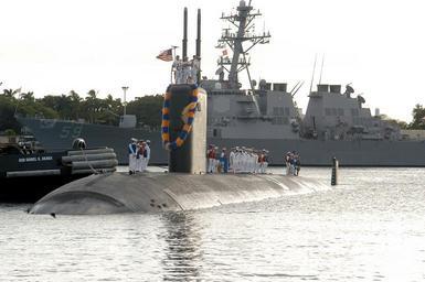 Keywords: released pearl harbor pearlharbor hawaii (hi) hawaiihi united states of america (usa) unitedstatesofamericausa outdoor 330-CFD-DN-SD-04-10799: Port bow view of the US Navy (USN) Los Angeles Class; Attack Submarine, USS Columbus (SSN 762), showing Sailors on deck as the boat is assisted by a commercial tugboat, while docking at is home port of Pearl Harbor, Hawaii (H1), following a 6-month deployment to the Western Pacific. The USN Arleigh Burke Class (FLIGHT I): Guided Missile Destroyer (AEGIS), USS Russell (DDG 59) is visible in the background, 4/28/2004. PH2 John Looney, USN. (OPA-NARA II-2016/02/06). 330-CFD-DN-SD-04-10799: Port bow view of the US Navy (USN) Los Angeles Class; Attack Submarine, USS Columbus (SSN 762), showing Sailors on deck as the boat is assisted by a commercial tugboat, while docking at is home port of Pearl Harbor, Hawaii (H1), following a 6-month deployment to the Western Pacific. The USN Arleigh Burke Class (FLIGHT I): Guided Missile Destroyer (AEGIS), USS Russell (DDG 59) is visible in the background, 4/28/2004. PH2 John Looney, USN. (OPA-NARA II-2016/02/06). |