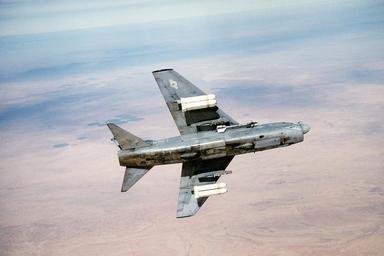Keywords: n0710 iraq vehicle aircraft airplane outdoor 330-CFD-DN-ST-91-05573: An Attack Squadron 72 (VA-72) A-7E Corsair aircraft banks to the left while en-route to its target during Operation Desert Storm. The aircraft is carrying six Mark 20 Rockeye II anti-tank cluster bombs on its outboard wing pylons and an AIM-9 Sidewinder missile on each of its fuselage pylons. VA-72 is based aboard the aircraft carrier USS John F. Kennedy (CV-67), which is operating in the Red Sea, 2/1/1991. Commander Leenhouts. (OPA-NARA II-9/21/2015). 330-CFD-DN-ST-91-05573: An Attack Squadron 72 (VA-72) A-7E Corsair aircraft banks to the left while en-route to its target during Operation Desert Storm. The aircraft is carrying six Mark 20 Rockeye II anti-tank cluster bombs on its outboard wing pylons and an AIM-9 Sidewinder missile on each of its fuselage pylons. VA-72 is based aboard the aircraft carrier USS John F. Kennedy (CV-67), which is operating in the Red Sea, 2/1/1991. Commander Leenhouts. (OPA-NARA II-9/21/2015). |