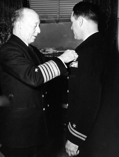 | Keywords: blackandwhite monochrome indoor black and white 330-PS-2537 (USN 708530): Admiral Donald B. Duncan, USN, (left), presents the Navy Cross to Lieutenant Eugene E. Clark, USN, during a ceremony at the Pentagon. Photograph released February 21, 1952. (5/26/2015). Citation: The President of the United States takes pleasure in presenting the Navy Cross to Eugene F. Clark, Lieutenant, U.S. Navy, for extraordinary heroism in connection with military operations against an armed enemy of the United Nations while serving with Special Operations Group, G-2, Headquarters, Far East Command, in enemy-held territory in North Korea on 13 and 14 September 1951. Lieutenant Clark was a member of a special operations group which landed in enemy-occupied territory to perform a confidential mission. Lieutenant Clark, in charge of the shore party, proceeded by boat from an offshore rendezvous lying approximately twenty miles offshore through rough seas to a point approximately two hundred yards off the beach of enemy-held territory, known to be occupied and in the process of being mined by Chinese Communist forces in anticipation of an invasion by United States forces. He then transferred to a small rubber boat and landed through the surf on the beach where he contacted friendly personnel who had been operating in that area. He then proceeded inland to the vicinity of an enemy-occupied village, reconnoitered the area and posted guards at the village and northward from the landing point to intercept Chinese Communist patrols in order to protect the remainder of the party during the performance of the confidential mission. On completion of the mission he returned by rubber boat through a surf which had subsequently become heavier and increasingly dangerous to the off-shore rendezvous. The hazards of capture based on losses of preceding groups, together with warnings received from ashore that the enemy was aware of the planned operation did not deter this gallant officer from continuing to volunteer and successfully completing the mission. He was well aware that if he fell into the hands of the enemy, who were on the alert and occupying the entire area, he could anticipate the same fate as those who had preceded him; that is, torture followed by death. Lieutenant Clark's display of outstanding courage and gallantry uphold the highest traditions of the United States Naval Service. 330-PS-2537 (USN 708530): Admiral Donald B. Duncan, USN, (left), presents the Navy Cross to Lieutenant Eugene E. Clark, USN, during a ceremony at the Pentagon. Photograph released February 21, 1952. (5/26/2015). Citation: The President of the United States takes pleasure in presenting the Navy Cross to Eugene F. Clark, Lieutenant, U.S. Navy, for extraordinary heroism in connection with military operations against an armed enemy of the United Nations while serving with Special Operations Group, G-2, Headquarters, Far East Command, in enemy-held territory in North Korea on 13 and 14 September 1951. Lieutenant Clark was a member of a special operations group which landed in enemy-occupied territory to perform a confidential mission. Lieutenant Clark, in charge of the shore party, proceeded by boat from an offshore rendezvous lying approximately twenty miles offshore through rough seas to a point approximately two hundred yards off the beach of enemy-held territory, known to be occupied and in the process of being mined by Chinese Communist forces in anticipation of an invasion by United States forces. He then transferred to a small rubber boat and landed through the surf on the beach where he contacted friendly personnel who had been operating in that area. He then proceeded inland to the vicinity of an enemy-occupied village, reconnoitered the area and posted guards at the village and northward from the landing point to intercept Chinese Communist patrols in order to protect the remainder of the party during the performance of the confidential mission. On completion of the mission he returned by rubber boat through a surf which had subsequently become heavier and increasingly dangerous to the off-shore rendezvous. The hazards of capture based on losses of preceding groups, together with warnings received from ashore that the enemy was aware of the planned operation did not deter this gallant officer from continuing to volunteer and successfully completing the mission. He was well aware that if he fell into the hands of the enemy, who were on the alert and occupying the entire area, he could anticipate the same fate as those who had preceded him; that is, torture followed by death. Lieutenant Clark's display of outstanding courage and gallantry uphold the highest traditions of the United States Naval Service. |