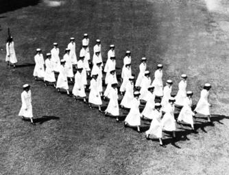 | Keywords: blackandwhite monochrome outdoor black and white 330-PS-2877 (USN 708652): Ten Years of the WAVY Blue: Drill Team. The WAVES have been famous for their drill teams, one of which was recently featured in a movie. The WAVE Drill Team of the Naval Training Center at Bainbridge, Maryland, sticks out as they begin one of the many formations executed by the 34 WAVE Trainees. This drill formation, like the formations used going to classes, help the nautically minded women volunteers to better understand the necessity for a smart trim unit needed to win the competitive honors awarded WAVE companies going through their “Boot Camp.” Photograph released July 24, 1952. (5/12/2015). 330-PS-2877 (USN 708652): Ten Years of the WAVY Blue: Drill Team. The WAVES have been famous for their drill teams, one of which was recently featured in a movie. The WAVE Drill Team of the Naval Training Center at Bainbridge, Maryland, sticks out as they begin one of the many formations executed by the 34 WAVE Trainees. This drill formation, like the formations used going to classes, help the nautically minded women volunteers to better understand the necessity for a smart trim unit needed to win the competitive honors awarded WAVE companies going through their “Boot Camp.” Photograph released July 24, 1952. (5/12/2015). |