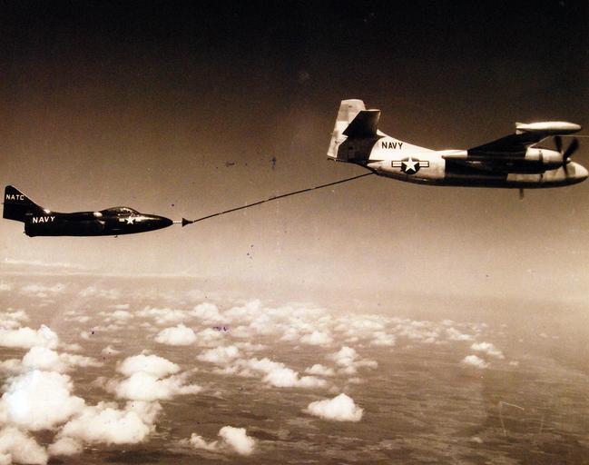 | Keywords: outdoor 330-PS-2938 (USN 708695): US Navy Develops Refueling System for Carrier Planes in Flight. Successful development of an in-flight refueling system for carrier aircraft. Modeled after the British “Drogue and Probe” Method, the U.S. Navy’s in-flight refueling technique is accomplished when the pilot flies his aircraft, equipped with a refueling lance, into the probe device fastened at the end of the hose on a tanker aircraft. Various U.S. Navy carrier fighters are being equipped with refueling equipment. Tactical advantages to be gained by mid-air refueling are longer range offensive missions, combat air patrols for longer periods, and increased armament loads by fighter aircraft, carrying only minimum fuel at takeoff, and refueling in the air, en-route to targets. This AJ “Savage” modified for use as a “tanker” refuels a Grumman F9F “Panther” in evaluation tests at Naval Air Test Center, Patuxent River, Maryland, August 25, 1952. (5/12/2015). 330-PS-2938 (USN 708695): US Navy Develops Refueling System for Carrier Planes in Flight. Successful development of an in-flight refueling system for carrier aircraft. Modeled after the British “Drogue and Probe” Method, the U.S. Navy’s in-flight refueling technique is accomplished when the pilot flies his aircraft, equipped with a refueling lance, into the probe device fastened at the end of the hose on a tanker aircraft. Various U.S. Navy carrier fighters are being equipped with refueling equipment. Tactical advantages to be gained by mid-air refueling are longer range offensive missions, combat air patrols for longer periods, and increased armament loads by fighter aircraft, carrying only minimum fuel at takeoff, and refueling in the air, en-route to targets. This AJ “Savage” modified for use as a “tanker” refuels a Grumman F9F “Panther” in evaluation tests at Naval Air Test Center, Patuxent River, Maryland, August 25, 1952. (5/12/2015). |