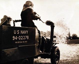Keywords: outdoor 330-PS-3012 (USN 708721): New Navy Jeep Fire Engine. Featuring a self-contained fire-extinguishing system capable of delivering 1,300 gallons of fire-killing foam per minute for more than two minutes without refilling, the new jeep fire engine was demonstrated at the Naval Research Laboratory. Designed and built by the Laboratory primarily for use in fighting aircraft fires aboard large aircraft carriers, the new equipment required no other power supply than the 60H.P. jeep engine. Capable of spreading a protective cone of foam 30 feet in diameter, it can reach a crashed plane up to 90 feet away. The raw materials for making the foam are carried in small tanks on the jeep. The system can be put in operation simply by opening two valves and speeding up the jeep engine. Requiring only a two-man team, anyone who can drive a jeep and pull a knob can operate it. Designed to supplement the larger-capacity piped foam system aboard aircraft carriers, the jeep fire engine in simulated crash-fire tests, covering 600 square feet and using 150 gallons of gasoline, “rescues” have been made within 24 seconds after it went into action. Photograph released October 7, 1952. (5/12/2015). 330-PS-3012 (USN 708721): New Navy Jeep Fire Engine. Featuring a self-contained fire-extinguishing system capable of delivering 1,300 gallons of fire-killing foam per minute for more than two minutes without refilling, the new jeep fire engine was demonstrated at the Naval Research Laboratory. Designed and built by the Laboratory primarily for use in fighting aircraft fires aboard large aircraft carriers, the new equipment required no other power supply than the 60H.P. jeep engine. Capable of spreading a protective cone of foam 30 feet in diameter, it can reach a crashed plane up to 90 feet away. The raw materials for making the foam are carried in small tanks on the jeep. The system can be put in operation simply by opening two valves and speeding up the jeep engine. Requiring only a two-man team, anyone who can drive a jeep and pull a knob can operate it. Designed to supplement the larger-capacity piped foam system aboard aircraft carriers, the jeep fire engine in simulated crash-fire tests, covering 600 square feet and using 150 gallons of gasoline, “rescues” have been made within 24 seconds after it went into action. Photograph released October 7, 1952. (5/12/2015). |