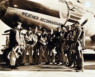 | Keywords: 330-PS-3256 (45886 AC): The USAF crew pictured here was used to track radioactive clouds resulting from atomic detonations at the Atomic Energy Commission’s Nevada Proving Ground during 1952 nuclear tests. Cloud-tracing crews and planes performed work vital to the scientists, and also insured safety to commercial airliners and to people living outside of the test area in charting such courses of radioactive clouds. Captain I.H. Watson, plane commander (far left), is shown briefing his cloud-tracing crew, left to right: First Lieutenant N. J. DiFrancesco; First Lieutenant C.E. Coppage; Captain L. Stockton; Captain J.B. Slaughter; Second Lieutenant R. E. Fine; Master Sergeant J. H. Walker; Captain A. K. Johnson; Staff Sergeant E.C. Bishop; Staff Sergeant E. G. Hirsch; and Staff Sergeant C.E. Crown. Photograph released March 16, 1953. (5/5/2015). 330-PS-3256 (45886 AC): The USAF crew pictured here was used to track radioactive clouds resulting from atomic detonations at the Atomic Energy Commission’s Nevada Proving Ground during 1952 nuclear tests. Cloud-tracing crews and planes performed work vital to the scientists, and also insured safety to commercial airliners and to people living outside of the test area in charting such courses of radioactive clouds. Captain I.H. Watson, plane commander (far left), is shown briefing his cloud-tracing crew, left to right: First Lieutenant N. J. DiFrancesco; First Lieutenant C.E. Coppage; Captain L. Stockton; Captain J.B. Slaughter; Second Lieutenant R. E. Fine; Master Sergeant J. H. Walker; Captain A. K. Johnson; Staff Sergeant E.C. Bishop; Staff Sergeant E. G. Hirsch; and Staff Sergeant C.E. Crown. Photograph released March 16, 1953. (5/5/2015). |