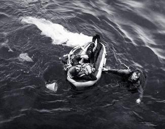 | Keywords: outdoor monochrome 330-PS-629 (USN 707938): U.S. Navy pilot rescued two miles off North Korean coast. In making an attack on shipping in North Korea port of Wonsan, Task Force 77 “Corsair” pilot Lieutenant Junior Grade Nathan E. Curry was hit by flak and forced to parachute into the water. A plane in company radioed a patrolling destroyer for help. Two and hone half hours later, the badly burned pilot was picked-up from his one-man raft by the destroyer. During the rescue operation, the destroyer was under threat of an attack by enemy plane, but the plane was driven off by planes of Task Force 77. He was given emergency medical treatment and the next day was transferred back to his carrier. In this photograph, Boiler Technician William A. Vogel tows the one-man raft toward the destroyer side. Note, parachute trailing in water. Injured pilot Curry was unable to remove it. The U.S. Navy ships were not identified. Photograph released August 1950. (7/14/2015). 330-PS-629 (USN 707938): U.S. Navy pilot rescued two miles off North Korean coast. In making an attack on shipping in North Korea port of Wonsan, Task Force 77 “Corsair” pilot Lieutenant Junior Grade Nathan E. Curry was hit by flak and forced to parachute into the water. A plane in company radioed a patrolling destroyer for help. Two and hone half hours later, the badly burned pilot was picked-up from his one-man raft by the destroyer. During the rescue operation, the destroyer was under threat of an attack by enemy plane, but the plane was driven off by planes of Task Force 77. He was given emergency medical treatment and the next day was transferred back to his carrier. In this photograph, Boiler Technician William A. Vogel tows the one-man raft toward the destroyer side. Note, parachute trailing in water. Injured pilot Curry was unable to remove it. The U.S. Navy ships were not identified. Photograph released August 1950. (7/14/2015). |