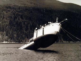 | Keywords: outdoor 330-PSA-207-62 (USN 1061431): Floating Instrument Platform (FLIP). FLIP in a stage of flipping. Photograph released August 7, 1962. Master caption: A new type of oceanographic research vessel – Floating Instrument Platform (FLIP) – is undergoing operational tests by the U.S. Navy in Dabob Bay, near Seattle, Washington. FLIP has been constructed for the Marine Physical Laboratory of Scrupps Institution of Oceanography under contract to the Office of Naval Research. The craft can literally flip from a horizontal to a vertical position while at sea. FLIP is flipped into the vertical position by flooding its long aft section with sea water. Only its “four story” bow section remains above the water. To return the vessel to a horizontal position, high pressure air blows the water out of the submerged section. FLIP will be used for studies of wave motion, marine biology, internal waves, sound waves, and other phenomena. The vessel has accommodation for four people and can carry enough supplies to last for about two weeks. In the vertical position, the research laboratories, living quarters, and engine room are above the water. Two diesel engines supply electrical power for air conditioning and other miscellaneous electrical equipment. Two waterfront tubes permit the crew to descent to 150 feet below the water. Upon completion of the tests in Dabob Bay, FLIP will be towed to San Diego, California, to begin its sea voyages. (10/6/2015). 330-PSA-207-62 (USN 1061431): Floating Instrument Platform (FLIP). FLIP in a stage of flipping. Photograph released August 7, 1962. Master caption: A new type of oceanographic research vessel – Floating Instrument Platform (FLIP) – is undergoing operational tests by the U.S. Navy in Dabob Bay, near Seattle, Washington. FLIP has been constructed for the Marine Physical Laboratory of Scrupps Institution of Oceanography under contract to the Office of Naval Research. The craft can literally flip from a horizontal to a vertical position while at sea. FLIP is flipped into the vertical position by flooding its long aft section with sea water. Only its “four story” bow section remains above the water. To return the vessel to a horizontal position, high pressure air blows the water out of the submerged section. FLIP will be used for studies of wave motion, marine biology, internal waves, sound waves, and other phenomena. The vessel has accommodation for four people and can carry enough supplies to last for about two weeks. In the vertical position, the research laboratories, living quarters, and engine room are above the water. Two diesel engines supply electrical power for air conditioning and other miscellaneous electrical equipment. Two waterfront tubes permit the crew to descent to 150 feet below the water. Upon completion of the tests in Dabob Bay, FLIP will be towed to San Diego, California, to begin its sea voyages. (10/6/2015). |