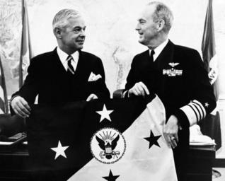 Keywords: blackandwhite monochrome black and white 330-PSA-267-64 (USN 1107406): Secretary of the Navy Paul R. Nitze, December 11, 1964, presented a new official flag to the Chief of Naval Operations, Admiral David L. McDonald, USN. It is the first flag authorized for the exclusive use of the Chief of Naval Operations. The blue and white flag bears a recently adopted Navy Seal – an eagle perched on a gold anchor and surrounded by 50 lines of gold-anchor chain. It was designed by Doctor Thomas W. McKnew of the National Geographic Society. On January 1, 1965, the flag was placed into service. Photograph by PHC H.W. Switzer, USN. Photograph released December 11, 1964. (2015/11/03). 330-PSA-267-64 (USN 1107406): Secretary of the Navy Paul R. Nitze, December 11, 1964, presented a new official flag to the Chief of Naval Operations, Admiral David L. McDonald, USN. It is the first flag authorized for the exclusive use of the Chief of Naval Operations. The blue and white flag bears a recently adopted Navy Seal – an eagle perched on a gold anchor and surrounded by 50 lines of gold-anchor chain. It was designed by Doctor Thomas W. McKnew of the National Geographic Society. On January 1, 1965, the flag was placed into service. Photograph by PHC H.W. Switzer, USN. Photograph released December 11, 1964. (2015/11/03). |