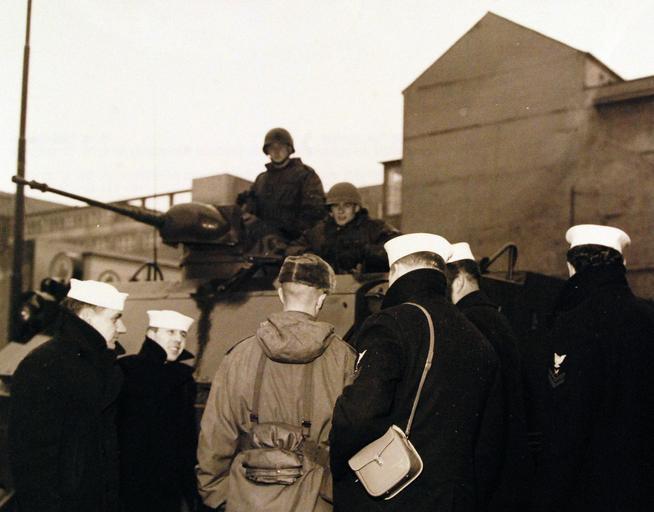 | Keywords: monochrome 330-PSA-28-62 (USN 1059099): Berlin Crisis of 1961. The Reservists talk to U.S. Army personnel at a U.S. Army tank park 500 years from Checkpoint Charlie. The station is kept battle ready 24 hours a day by 150 men. Located on the Friedrichstrasse, Checkpoint Charlie is the only American checking station along the Berlin Wall. Master Caption: One hundred seventy-two U.S. Naval Reservists called to active duty in 1961 because of the Berlin Crisis visited Berlin January 12 and 13 for a first-hand look at the Berlin situation. The reservists breakfasted with the district mayors of Keukoeln and were welcomed to the city by Major General Albert Watson II, U.S. Commander, Berlin, who briefed them of the U.S. Army’s mission in Germany. For lunch they were guests of the Third Battle Group, 6th Infantry, of the U.S. Army’s Berlin Brigade. During the day, they toured West and East Berlin, visited the Army’s tank park and witnessed a weapons demonstration. The Reservists are crewmen of four Naval Reserve Training Ships which were activated in the fall. The ships, all destroyers: USS Hunt; USS Millar; USS Robinson; and USS Remey. Photograph released January 29, 1962. (9/29/2015). 330-PSA-28-62 (USN 1059099): Berlin Crisis of 1961. The Reservists talk to U.S. Army personnel at a U.S. Army tank park 500 years from Checkpoint Charlie. The station is kept battle ready 24 hours a day by 150 men. Located on the Friedrichstrasse, Checkpoint Charlie is the only American checking station along the Berlin Wall. Master Caption: One hundred seventy-two U.S. Naval Reservists called to active duty in 1961 because of the Berlin Crisis visited Berlin January 12 and 13 for a first-hand look at the Berlin situation. The reservists breakfasted with the district mayors of Keukoeln and were welcomed to the city by Major General Albert Watson II, U.S. Commander, Berlin, who briefed them of the U.S. Army’s mission in Germany. For lunch they were guests of the Third Battle Group, 6th Infantry, of the U.S. Army’s Berlin Brigade. During the day, they toured West and East Berlin, visited the Army’s tank park and witnessed a weapons demonstration. The Reservists are crewmen of four Naval Reserve Training Ships which were activated in the fall. The ships, all destroyers: USS Hunt; USS Millar; USS Robinson; and USS Remey. Photograph released January 29, 1962. (9/29/2015). |