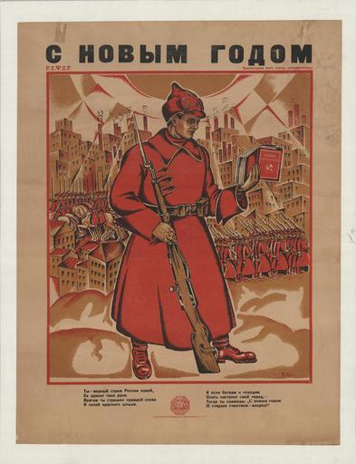 | Keywords: 33 Sammlung Eybl Russland. Kohout. С новым годом. (Ein gutes neues Jahr!). 1918 -1919. 85 x 65 cm. (Slg.Nr. 1818).jpg de Russland Kohout С новым годом Ein gutes neues Jahr 1918/1919 85 x 65 cm Slg Nr 1818 Ein Soldat der Roten Armee liest im Buch «Азбука коммунизма» Das Alphabet des Kommunismus Sowohl Inhalt als auch Form des Plakates verkünden eine neue Zeit In der zaristischen Armee waren noch mehr als 80 der Soldaten hauptsächlich Bauernsöhne Analphabeten der Soldat der Roten Armee liest Die Stadt im Hintergrund verweist auf die Herkunft des neuen Roten Soldaten aus dem urbanen Proletariat Das bekräftigt auch der kleine Untertitel rechts oben Proletarier des ganzen Landes verbindet euch Die Stadt im Hintergrund ist aus kubistischen Elementen zusammengesetzt auch in der Malerei bildete die Russische Revolution eine Zäsur Sammlung Eybl Plakatmuseum Wien 2015-09-17 10 30 40 A Erhardt Credit line Eybl Plakatmuseum Wien/Wikimedia Commons CC-BY-SA-4 0 wiki Sammlung Eybl Plakatmuseum Wien PD-old World War I posters of Russia Plakatmuseum Wien Eybl Collection Quality images by Hubertl QualityImage |