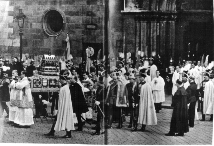 | Keywords: 34. Eucharisztikus Világkongresszus, Budapest, Körmenet a Koronázó Templomnál 1938 (5).jpg hu 34 Eucharisztikus Világkongresszus Budapest 1938 1938 május 25-én ünnepélyes külsÅ‘ségek közepette megkezdÅ‘dik Budapesten a 34 Eucharisztikus Világkongresszus Az eucharisztia magyarul oltáriszentséget jelent a kongresszusi mozgalom ennek jegyében Krisztus társadalmilag elismerhetÅ‘ és érvényesÃthetÅ‘ hatalmát a világban való valóságos jelenlétét hirdeti Ennek az eszmének a tiszteletére szervezi meg a katolikus egyház 1881 óta a nemzetközi eucharisztikus kongresszusokat Az 1938 május 25-29 között lezajlott istentiszteletek ünnepségek kongresszusi ülések és körmenetek a magyar katolikus egyház erejét és a világegyházzal való egységét kÃvánták bizonyÃtani Eugenio Pacelli bÃboros államtitkár a pápa legátusa aki késÅ‘bb XII Pius néven lett pápa és a résztvevÅ‘k többsége Az önmagában is hatalmas Ãvű nemzetközi eseményt összekapcsolták egy nagy hazai ünnepségsorozattal amely a 30-as években erÅ‘teljesen megnyilvánuló Szent István-kultusz betetÅ‘zéseként a szentté avatott király 900 évfordulóját volt hivatott megünnepelni A kongresszus fÅ‘védnöke a református Horthy természetszerűleg nem lehetett Ãgy a római katolikus kormányzóné kapta ezt a feladatot A kortárs megfigyelõk szerint a politikusok közül inkább Imrédy miniszterelnök szereplése dominált akinek egyébként a Kongresszus elõtti hetekben történõ kinevezésében nem kevessé játszott szerepet közismerten elkötelezett katolikussága A Szent István-év legfÅ‘bb védnöke azonban már Horthy volt aki tudatosan igyekezett is felvállalni ezt az örökséget A két esemény de elsÅ‘sorban a kongresszus elképesztÅ‘ szÃnpompával és nagyszabásúan került megrendezésre A küldöttek és vendégek 33 országból érkeztek mintegy 50 ezren a hazai résztvevÅ‘k száma néhol elérte a félmilliót is Több tÃzezres körmenetek különleges éjszakai szentségimádások majd félmilliós szentmisék pazar budapesti dÃszkivilágÃtás hatalmas és dÃszes vendégsereg tette emlékezetessé az eseményeket A bolsevik Oroszország és náci Németország nem képviseltette magát a kongresszuson A kongresszus 1938 május 15 - az ún Egyházközségi Munkásszakosztályok 25 ezres felvonulása 1938 május 22 - A M kir álammrendörség szentmiséje a Bazilikában 3000 fõs közös áldozással 1938 május 24 - Reggel Pacelli legátust köszöntik az ország több pontján Nagykanizsa Székesfehérvárott Teleki pl 1938 május 24 - Délelõtt A Keleti pályaudvaron ünnepélyesen fogadja Horthy és a kormány a legátust 1938 május 24 - Délben ElõkészÃtõ Nagygyûlés az à nnepi Csarnokban 1938 május 24 - Este à dvözlõ Est a legátus tiszteletére az à nnepi Csarnokban 1938 május 24 - A Nemzetközi Karitász KiállÃtás megnyitója Horthy Serédi stb részvételével 1938 május 25 - Reggel Megnyitó szentmise a Bazilikában 1938 május 25 - Délután 1/2 5-tõl a résztvevõ elõkelõségek dÃszbevonulásával megkezdõdik a Kongresszus 1938 május 25 - XI Pius ünnepi bullájának felolvasása Serédi ünnepi beszéde Hóman Bálint miniszteri megnyitója majd a bÃboros legátus Pacelli ünnepi beszéde 1938 május 25 - Este 8 óra Horthy a Várban fogadást ad Pacelli legátus tiszteletére 1938 május 26 - A Gyermekek szentáldozása 150 ezer áldozóval 1938 május 26 - Délelõtt 1/2 12 Papi eucharisztikus gyûlés a Bazilikában 1938 május 26 - Elsõ nemzetközi gyûlés az à nnepi Csarnokban 1938 május 26 - Este Hajós körmenet az Oltáriszentséggel a Dunán 1938 május 27 - Reggel A katonák szentmiséje a Hõsök-terén 1938 május 27 - Délelõtt Aranyszájú Szent János miséje görög nyelven a Bazilikában 1938 május 27 - Szakosztályi ülések 1938 május 27 - Délután Második nemzetközi gyûlés Imrédy beszédével 1938 május 27 - Éjszaka a toledoi bÃboros éjféli miséje 150 ezer áldozó férfival 1938 május 28 - Délelõtt Magyar leányifjúsági gyûlés az à nnepi Csarnokban 1938 május 28 - Szakosztályi ülések 1938 május 28 - Délután Harmadik nemzetközi gyûlés 1938 május 28 - Estefelé A falu lányai köszöntik a kongresszus fõvédnökét 1938 május 28 - Este DÃszelõadás az Operaházban utána fogadás a Parlamentben 1938 május 29 - Délelõtt A katolikus agrárifjúság felvonulása KALOT 1938 május 29 - Délután Az Oltáriszentség diadalmenete a Bazilikából a Hõsök-terére milliós sorfallal az utcákon 1938 május 29 - Délután A pápai legátus félmilliós záró nagymiséje és a pápa szózata a Vatikáni Rádión keresztül kihangosÃtva 1938 május 29 - Este Pacelli búcsúzó rádiószózata 1938 május 30 - A Szent István-év meghirdetése 1938 május 31 - Délután A pápai legátus dÃszes autós felvonulással búcsúzik 18 órakor vonata kifut a Keleti pályaudvarról SzerzÅ‘i jog PD-old-70 Források http //www bibl u-szeged hu/ha/esemeny/euch/unnepsegek html http //budapestcity org/02-tortenet/1938-eucharisztikus-vilagkongresszus/index-hu htm Cimkék 34 Eucharisztikus Világkongresszus Budapest 1938 Metapolisz 2012-03-15 saját tulajdon author Custom license marker 2012 03 15 PD-old-70 Uploaded with UploadWizard 34th International Eucharistic Congress in Budapest Metapolisz Holy right hand 1938 photographs DÃszmagyar Clergy from Hungary |