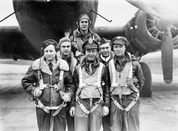 | Keywords: 385th Bombardment Group B-17F Flying Fortress Crew.jpg en A bomber crew of the 385th Bomb Group with their B-17 Flying Fortress Image stamped on reverse 'Planet News ' stamp 'Passed for publication 6 Nov 1943 ' stamp and '291701 ' Censor no Printed caption on reverse Printed caption on reverse 'US AIRFORCE IN GREAT DAYLIGHT OFFENSIVE ON EUROPE The great daylight offensive on Europe continues targets in Germany France and Belgium being attacked by great formations of bombers and fighters from the US Army Air Force and the RAF Photo shows Before they take off on the great Ruhr raid- six airmen who together represent 100 operations against the Nazis Left to right front row Lieut Fred D Albert of Bronx NY navigator; Lieut Theodore J Kleuser of Little Rock Arkansas co-pilot; Lieut Ruel Weikert of Dayton Ohio pilot and commander of the aircraft Second row Tech Sgt Darwin Mushrush of Castaque Pa; top turret gunner and engineer; Lieut Tom Betow of Marion Wisconsin bombardier Back row Tech Sgt Walter Clowniuk of Detroit Mich; radio gunner NC 6th November 1943 PN ' 1943 http //www americanairmuseum com/media/903 United States Army Air Forces other versions PD-USGov Uploaded with UploadWizard RAF Great Ashfield Military fur clothing Sheepskin clothing B-17F Fur fashion in 1943 385th Bombardment Group United States Army Air Forces Group photographs with aircraft military |