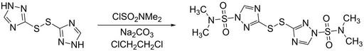 | Keywords: 3,3'-disulfanediylbis(N,N-dimethyl-1H-1,2,4-triazole-1-sulfonamide) synthesis.svg validSVG Synthesis of 3 3'-disulfanediylbis N N-dimethyl-1H-1 2 4-triazole-1-sulfonamide Own 2014-03-06 Emeldir <span class signature-talk >talk</span> PD-chem Fungicide syntheses |