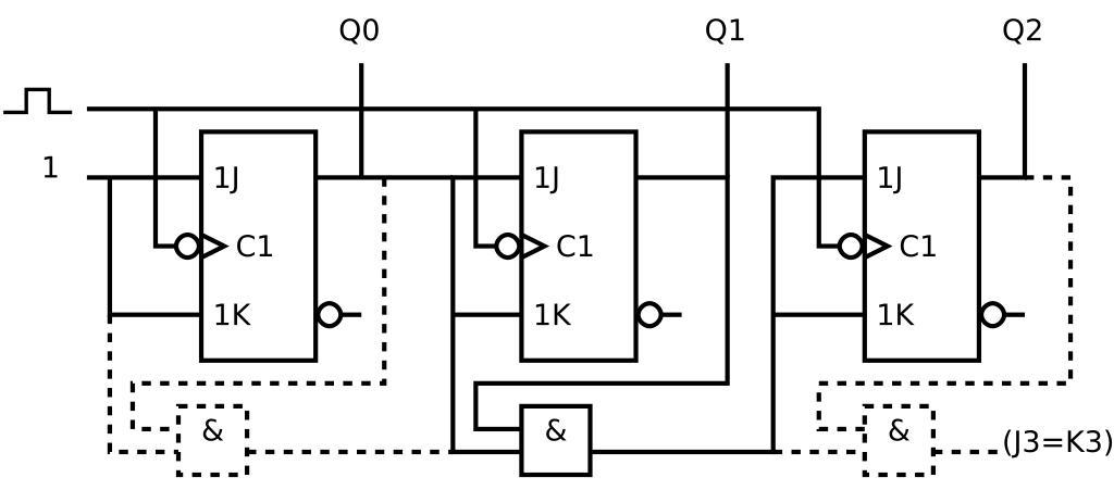 | Keywords: 3 bit up synchronous counter.svg en Negative edge-triggered JK flip-flop based 3 bit up synchronous counter es Contador síncrono ascendente de 3 bits basado en flip-flops JK sincronizados por flanco descendente own Dizquierdol Made with Dia v0 97 1 Cc-zero Counter circuits |
