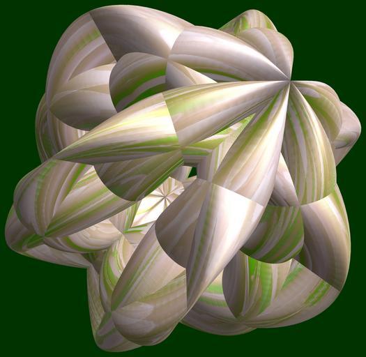 Keywords: mathematica 3d cg parametricplot3d texture torus 輪環 りんかん ドーナツ どーなつ 五芒星 ごぼうせい 五光星 ごこうせい 五稜星 ごりょうせい program プログラム code コード algorithm コード アルゴリズム pentagram geometric sculpture geometricsculpture shape geometry sculpture mapping テクスチャ マッピング 模様 もよう design pattern デザイン パターン graphic グラフィック グラフィクス structure 意匠 構造 symmetry 対称性 たいしょうせい シンメトリー 対称 たいしょう algorithm pastel serene photo border black background a = 3; (* center hole size of a torus *) b = 5; (* penta-torus *) d = 3; (* number of torus *) v = 3; w = 1.7; SetOptions[ParametricPlot3D, PlotRange -> Full, Mesh -> None, Boxed -> False, Axes -> None, PlotPoints -> 400, ImageSize -> 3000, Background -> Darker[Green, 0.8], PlotStyle -> Directive[Specularity[White, 30], Texture[Import["D:/tmp/862.jpg"]]], TextureCoordinateFunction -> ({#4, #5} &), Lighting -> "Neutral"]; x = (a - Cos[w t] - Sin[b s]) Cos[v (s + Pi/(2 b))]; y = Sin[w t] Cos[b s]; z = (a - Cos[w t] - Sin[b s]) Sin[v (s + Pi/(2 b))]; rot = Table[{x, y, z}.RotationMatrix[2 i Pi/d, {1, 0, 0}], {i, d}]; ParametricPlot3D[rot, {t, 0, 2 Pi}, {s, 0, 2 Pi}] (*--- The Texture *) a = 3; (* center hole size of a torus *) b = 5; (* penta-torus *) d = 3; (* number of torus *) v = 3; w = 1.7; SetOptions[ParametricPlot3D, PlotRange -> Full, Mesh -> None, Boxed -> False, Axes -> None, PlotPoints -> 400, ImageSize -> 3000, Background -> Darker[Green, 0.8], PlotStyle -> Directive[Specularity[White, 30], Texture[Import["D:/tmp/862.jpg"]]], TextureCoordinateFunction -> ({#4, #5} &), Lighting -> "Neutral"]; x = (a - Cos[w t] - Sin[b s]) Cos[v (s + Pi/(2 b))]; y = Sin[w t] Cos[b s]; z = (a - Cos[w t] - Sin[b s]) Sin[v (s + Pi/(2 b))]; rot = Table[{x, y, z}.RotationMatrix[2 i Pi/d, {1, 0, 0}], {i, d}]; ParametricPlot3D[rot, {t, 0, 2 Pi}, {s, 0, 2 Pi}] (*--- The Texture *) |