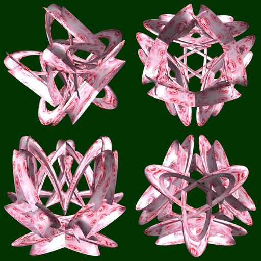 Keywords: mathematica 3d cg parametricplot3d texture torus 輪環 りんかん ドーナツ どーなつ 五芒星 ごぼうせい 五光星 ごこうせい 五稜星 ごりょうせい code program algorithm コード プログラム アルゴリズム pentagram geometric sculpture geometricsculpture shape geometry sculpture mapping テクスチャ マッピング 模様 もよう abstract 抽象 ちゅうしょう アブストラクト design pattern デザイン パターン graphic グラフィック グラフィクス structure 意匠 構造 symmetry 対称性 たいしょうせい シンメトリー 対称 たいしょう algorithm コード plant blossom flower flower cluster black background photo border organic pattern pastel outdoor a = 2; (* center hole size of a torus *) b = 5; (* penta-torus *) c = 2; (* distance from the center of rotation *) d = 3; (* number of torus *) h = 1; (* height of a torus *) SetOptions[ParametricPlot3D, PlotRange -> Full, Mesh -> None, Boxed -> False, Axes -> False, PlotPoints -> 400, ImageSize -> 1600, Background -> Darker[Green, 0.8], PlotStyle -> Directive[Specularity[White, 30], Texture[Import["D:/tmp/86.jpg"]]], TextureCoordinateFunction -> ({#4, #5 2 Pi} &), Lighting -> "Neutral"]; f[v_] := Cos[2 Cos[Cos[Cos[v]]]]; x = (a - f[t] - Sin[b s]) Cos[s + 3 Pi/(4 b)] + c; y = (a - f[t] - Sin[b s]) Sin[s + 3 Pi/(4 b)] + c; z = (a - Sin[t/2] - h Sin[b s]); rot = Table[{x, y, z}.RotationMatrix[2 i Pi/d, {1, 1, 1}], {i, d}]; ParametricPlot3D[rot, {t, 0, 2 Pi}, {s, 0, 2 Pi}] (*--- The Texture *) a = 2; (* center hole size of a torus *) b = 5; (* penta-torus *) c = 2; (* distance from the center of rotation *) d = 3; (* number of torus *) h = 1; (* height of a torus *) SetOptions[ParametricPlot3D, PlotRange -> Full, Mesh -> None, Boxed -> False, Axes -> False, PlotPoints -> 400, ImageSize -> 1600, Background -> Darker[Green, 0.8], PlotStyle -> Directive[Specularity[White, 30], Texture[Import["D:/tmp/86.jpg"]]], TextureCoordinateFunction -> ({#4, #5 2 Pi} &), Lighting -> "Neutral"]; f[v_] := Cos[2 Cos[Cos[Cos[v]]]]; x = (a - f[t] - Sin[b s]) Cos[s + 3 Pi/(4 b)] + c; y = (a - f[t] - Sin[b s]) Sin[s + 3 Pi/(4 b)] + c; z = (a - Sin[t/2] - h Sin[b s]); rot = Table[{x, y, z}.RotationMatrix[2 i Pi/d, {1, 1, 1}], {i, d}]; ParametricPlot3D[rot, {t, 0, 2 Pi}, {s, 0, 2 Pi}] (*--- The Texture *) |