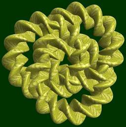 | Keywords: mathematica 3d cg parametricplot3d texture torus knot 輪環 りんかん ドーナツ どーなつ 結び むすび 捩れ よじれ プログラム コード code program algorithm コード アルゴリズム geometric sculpture geometricsculpture shape geometry sculpture mapping テクスチャ マッピング 模様 もよう abstract 抽象 ちゅうしょう アブストラクト design pattern デザイン パターン graphic グラフィック グラフィクス structure 意匠 構造 symmetry 対称性 たいしょうせい シンメトリー 対称 たいしょう algorithm organic pattern black background foliage plant SetOptions[ParametricPlot3D, PlotRange -> Full, Mesh -> None, Boxed -> False, Axes -> None, PlotPoints -> 300, ImageSize -> 3000, Background -> Darker[Green, 0.8], PlotStyle -> Directive[Specularity[White, 90], Texture[Import["D:/tmp/71.jpg"]]], TextureCoordinateFunction -> ({#4, #5 b Pi} &), Lighting -> "Neutral"]; a = 5; (* center hole size of a torus *) b = 13; (* number of cross *) c = 2; (* distance from the center of rotation *) d = 3; (* number of torus *) x = (a - Cos[t] + Sin[b s]) Cos[2 s] + c; y = (a - Cos[t] + Sin[b s]) Sin[2 s] + c; z = Cos[b s] + Sin[t] + c; rot = Table[{x, y, z}.RotationMatrix[2 i Pi/d, {0, 0, 1}], {i, d}]; ParametricPlot3D[rot, {t, 0, 2 Pi}, {s, 0, 2 Pi}] (* --- The Texture is this: www.flickr.com/photos/tanaka_juuyoh/5239255695/ *) SetOptions[ParametricPlot3D, PlotRange -> Full, Mesh -> None, Boxed -> False, Axes -> None, PlotPoints -> 300, ImageSize -> 3000, Background -> Darker[Green, 0.8], PlotStyle -> Directive[Specularity[White, 90], Texture[Import["D:/tmp/71.jpg"]]], TextureCoordinateFunction -> ({#4, #5 b Pi} &), Lighting -> "Neutral"]; a = 5; (* center hole size of a torus *) b = 13; (* number of cross *) c = 2; (* distance from the center of rotation *) d = 3; (* number of torus *) x = (a - Cos[t] + Sin[b s]) Cos[2 s] + c; y = (a - Cos[t] + Sin[b s]) Sin[2 s] + c; z = Cos[b s] + Sin[t] + c; rot = Table[{x, y, z}.RotationMatrix[2 i Pi/d, {0, 0, 1}], {i, d}]; ParametricPlot3D[rot, {t, 0, 2 Pi}, {s, 0, 2 Pi}] (* --- The Texture is this: www.flickr.com/photos/tanaka_juuyoh/5239255695/ *) |