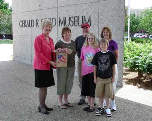 | Keywords: 3million2a400 NLGRF photo (2008-06-17)(Gerald Ford Library).jpg Gerald R Ford Library and Museum Director Elaine Didier at the Museum on June 17 2008 with the three millionth visitor Cindy Lund Cindy Lund in green was given an autographed copy of President Ford's autobiography Didier arranged for Susan Bales Ford and Steven Ford to call Lund to congratulate her Also photographed are Steve Lund Connie Dieleman and her children Angela and Daniel Event Three Millionth Visitor Location Gerald R Ford Museum Grand Rapids Michigan Date June 17 2008 Credit Courtesy Gerald R Ford Museum Rights Information Public Domain No usage fees no permission required 2008-06-17 Gerald R Ford Presidential Library Image http //www fordlibrarymuseum gov/photogallery/photo 20gallery 20images/3millionth1 html 3millionth1 html as from http //www fordlibrarymuseum gov/photogallery/3millionthvisitor asp 3millionthvisitor asp Courtesy Gerald R Ford Museum PD-USGov Institution Institution Gerald R Ford Presidential Library Elaine Didier Gerald R Ford Presidential Museum building |