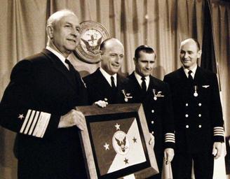 Keywords: people indoor 428-GX-USN 1042856: Admiral Thomas H. Moorer, Chief of Naval Operations, (left), accepts his personal flag from the three Apollo 12 astronauts who carried it with them during the moon mission. Admiral Moorer also presented them with the Distinguished Service Medal. Left to right: Charles Conrad, Richard Gordon and Alan Bean. Undated. U.S. Navy photograph, now in the collections of the National Archives. (2016/04/12). 428-GX-USN 1042856: Admiral Thomas H. Moorer, Chief of Naval Operations, (left), accepts his personal flag from the three Apollo 12 astronauts who carried it with them during the moon mission. Admiral Moorer also presented them with the Distinguished Service Medal. Left to right: Charles Conrad, Richard Gordon and Alan Bean. Undated. U.S. Navy photograph, now in the collections of the National Archives. (2016/04/12). |