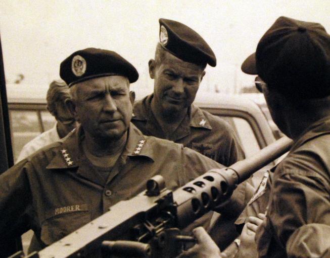 | Keywords: 428-GX-USN 1142474: Binh Thuy, Republic of Vietnam. Admiral Thomas H. Moorer, Chief of Naval Operations, listens as Rear Admiral William R. Flanagan, Deputy Commander, U.S. Naval Forces, Vietnam, explains the operations of a .50 caliber machine gun aboard UH-1B Iroquois helicopter, Captain Joseph R. Faulk, Commander River Patrol Force and Commander River Patrol Force and Commander River Patrol Flotilla Five looks on. Photographed by PH2 S.P. Langley, August 1969. U.S. Navy photograph, now in the collections of the National Archives. (2016/04/12). 428-GX-USN 1142474: Binh Thuy, Republic of Vietnam. Admiral Thomas H. Moorer, Chief of Naval Operations, listens as Rear Admiral William R. Flanagan, Deputy Commander, U.S. Naval Forces, Vietnam, explains the operations of a .50 caliber machine gun aboard UH-1B Iroquois helicopter, Captain Joseph R. Faulk, Commander River Patrol Force and Commander River Patrol Force and Commander River Patrol Flotilla Five looks on. Photographed by PH2 S.P. Langley, August 1969. U.S. Navy photograph, now in the collections of the National Archives. (2016/04/12). |