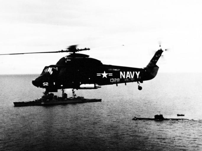 Keywords: blackandwhite monochrome outdoor black and white 428-GX-USN-1154393: Cold War, Soviet Ships. Mediterranean Sea. A light helicopter antisubmarine squadron 30 (HSL-30) SH-2D “Seasprite” Helicopter tracks a Soviet “Sverdlov” class cruiser and a Soviet submarine about sixty miles east of Gibraltar. The Seasprite is equipped with the Light Airborne Multipurpose System (LAMPS) and is assigned aboard USS William L. Standley (DLG-32). Photographed November 1972. U.S. Navy Photograph, now in the collections of the National Archives. (2016/05/03). 428-GX-USN-1154393: Cold War, Soviet Ships. Mediterranean Sea. A light helicopter antisubmarine squadron 30 (HSL-30) SH-2D “Seasprite” Helicopter tracks a Soviet “Sverdlov” class cruiser and a Soviet submarine about sixty miles east of Gibraltar. The Seasprite is equipped with the Light Airborne Multipurpose System (LAMPS) and is assigned aboard USS William L. Standley (DLG-32). Photographed November 1972. U.S. Navy Photograph, now in the collections of the National Archives. (2016/05/03). |