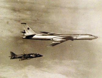 Keywords: vehicle aircraft 428-GX-USN 1156922: Atlantic Ocean. A British AV-8A “Harrier” advanced vertical take-off and landing aircraft in flight near a Soviet “Badger” Tu-16 bomber during an operation by U.S. Marines from USS Guam (LPH 9). Photographed February 1973. Official U.S. Navy photograph, now in the collections of the National Archives. (2016/07/19). 428-GX-USN 1156922: Atlantic Ocean. A British AV-8A “Harrier” advanced vertical take-off and landing aircraft in flight near a Soviet “Badger” Tu-16 bomber during an operation by U.S. Marines from USS Guam (LPH 9). Photographed February 1973. Official U.S. Navy photograph, now in the collections of the National Archives. (2016/07/19). |