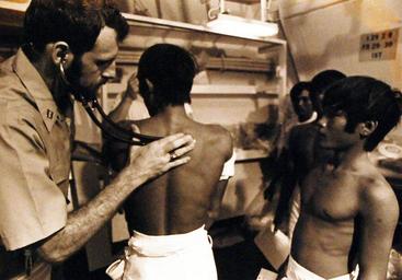 | Keywords: indoor 428-GX-USN 1176822: South China Sea. Lieutenant Richard T. Bosshardt, MC, checks the physical condition of one of the 49 Southeast Asian refugees who have come aboard USS Wabash (AOR-5). The people were picked up from two small craft and will be taken to Subic Bay by oiler. Photographed by PH2 Felimon Barbante, August 5, 1979. Official U.S. Navy Photograph, now in the collections of the National Archives. (2016/05/24). 428-GX-USN 1176822: South China Sea. Lieutenant Richard T. Bosshardt, MC, checks the physical condition of one of the 49 Southeast Asian refugees who have come aboard USS Wabash (AOR-5). The people were picked up from two small craft and will be taken to Subic Bay by oiler. Photographed by PH2 Felimon Barbante, August 5, 1979. Official U.S. Navy Photograph, now in the collections of the National Archives. (2016/05/24). |