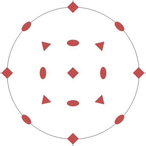 | Keywords: 432 point group.png en Stereographic representation of the symmetry point group 432 The 001 direction is perpendicular to the projection plane The rotation axes are represented in red The thin black ticks show the direction of the equivalent crystallographic axes a and b fr Représentation stéréographique du groupe ponctuel de symétrie 432 La direction 001 est perpendiculaire au plan de projection Les axes de rotation sont représentés en rouge Les trait fins noirs montrent la direction des axes cristallographiques équivalents a et b own Perditax 2011-06-06 Cc-zero Point groups |