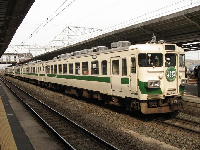 | Keywords: 455 S72 Koriyama 20080323.jpg en JR East 455 series set S72 at Koriyama Station on a special Farewell 455 series working ja ã Œã•よãªã‚‰455ç³»ã 臨時列車 郡山駅ã«ã¦ 2008-03-23 Self-photographed by the original uploader æ ¬äººæ’®å½± Transferred from Japanese Wikipedia; ja File 臨時㠌ã•よãªã‚‰455ç³»ã jpg ç·‘15å· w ja Custom license marker 2014 04 04 ç·‘15å· original upload log ã Œã•よãªã‚‰455ç³»ã 臨時列車ã 郡山駅ã«ã¦ Moved from Japanese Wikipedia/FileHistory UTC 2009-02-01 01 16 1 024 × 768 ç·‘15å· <nowiki> ã Œã•よãªã‚‰455ç³»ã 臨時列車ã 郡山駅ã«ã¦ï¼ˆ2008å¹´3æ ˆ23æ—¥ã æ ¬äººæ’®å½±ï¼‰ GFDL </nowiki> Moved from Japanese Wikipedia/PageHistory UTC 2009-02-01 01 16 ç·‘15å· <nowiki> ã Œã•よãªã‚‰455ç³»ã 臨時列車ã 郡山駅ã«ã¦ï¼ˆ2008å¹´3æ ˆ23æ—¥ã æ ¬äººæ’®å½±ï¼‰ GFDL </nowiki> Uploaded with UploadWizard JNR 455 JR East Trains at KÅriyama Station Fukushima Charter trains of Japan Rail transport events in Japan 2008 in rail transport in Japan 2008 events in Japan March 2008 in Japan Train headboards in Japan Green and white rail vehicles Number 455 on vehicles Photographs taken on 2008-03-23 Trains facing right |