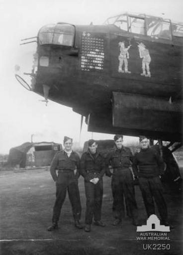| Keywords: 463 Squadron RAAF Lancaster and ground crew Waddington Dec 1944 AWM UK2250.jpg AWM caption Lincolnshire England 1944-12-06 Informal group portrait of maintenance crew in front of a Lancaster bomber aircraft of No 463 Squadron RAAF at RAF Station Waddington Note the noseart and the scoreboard showing the tally of their operations UK2250 1944-12-06 not stated Copyright expired - public domain PD-AustraliaGov Nose art on Avro Lancaster Avro Lancaster in Australian service RAF Waddington No 463 Squadron RAAF World War II forces of Australia in the United Kingdom |