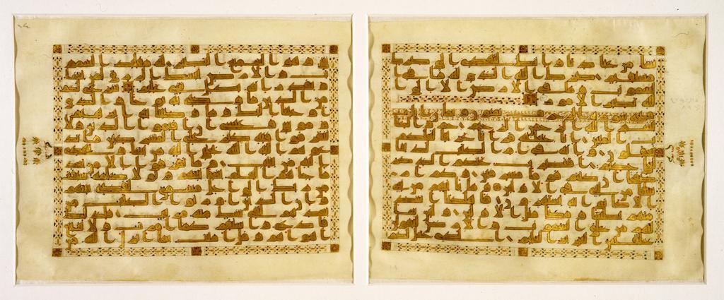 Keywords: 4.8-17-1990-Guld-koranside-recto-og-verso.jpg The leaves from this magnificent Koran written in gold and contoured with brown ink have a horizontal format This is admirably suited to classical Kufi calligraphy which became common under the early Abbasid caliphs The length of the up and down strokes is limited while there is a tendency to a horizontal prolongation Vowels are indicated with colored dots and consonant signs are found in the form of little oblique strokes There are different kinds of markers for each verse each fifth verse and each tenth verse The vase-like ornament in the margin is purely decorative The designation Kufi comes from the Iraqi city of Kufa where this script was erroneously believed to have originated First Page Shora52-53 وَكَذَٰلِكَ أَوْحَيْنَا إِلَيْكَ رُوحًا مِّنْ أَمْرِنَا ۚ مَا كُنتَ تَدْرِي مَا الْكِتَابُ وَلَا الْإِيمَانُ وَلَٰكِن جَعَلْنَاهُ نُورًا نَّهْدِي بِهِ مَن نَّشَاءُ مِنْ عِبَادِنَا ۚ وَإِنَّكَ لَتَهْدِي إِلَىٰ صِرَاطٍ مُّسْتَقِيمٍ 52 And thus We have revealed to you an inspiration of Our command You did not know what is the Book or what is faith but We have made it a light by which We guide whom We will of Our servants And indeed O Muhammad you guide to a straight path - صِرَاطِ اللَّهِ الَّذِي لَهُ مَا فِي السَّمَاوَاتِ وَمَا فِي الْأَرْضِ ۗ أَلَا إِلَى اللَّهِ تَصِيرُ الْأُمُورُ 53 The path of Allah to whom belongs whatever is in the heavens and whatever is on the earth Unquestionably to Allah do all matters evolve ---- Az-Zukhruf The Gold Adornment حم 1 Ha Meem وَالْكِتَابِ الْمُبِينِ 2 By the clear Book إِنَّا جَعَلْنَاهُ قُرْآنًا عَرَبِيًّا لَّعَلَّكُمْ تَعْقِلُونَ 3 Indeed We have made it an Arabic Qur'an that you might understand وَإِنَّهُ فِي أُمِّ الْكِتَابِ لَدَيْنَا لَعَلِيٌّ حَكِيمٌ 4 And indeed it is in the Mother of the Book with Us exalted and full of wisdom أَفَنَضْرِبُ عَنكُمُ الذِّكْرَ صَفْحًا أَن كُنتُمْ قَوْمًا مُّسْرِفِينَ 5 Then should We turn the message away disregarding you because you are a transgressing people وَكَمْ أَرْسَلْنَا مِن نَّبِيٍّ فِي الْأَوَّلِينَ 6 And how many a prophet We sent among the former peoples وَمَا يَأْتِيهِم مِّن نَّبِيٍّ إِلَّا كَانُوا بِهِ يَسْتَهْزِئُونَ 7 But there would not come to them a prophet except that they used to ridicule him فَأَهْلَكْنَا أَشَدَّ مِنْهُم بَطْشًا وَمَضَىٰ مَثَلُ الْأَوَّلِينَ 8 And We destroyed greater than them in striking power and the example of the former peoples has preceded وَلَئِن سَأَلْتَهُم مَّنْ خَلَقَ السَّمَاوَاتِ وَالْأَرْضَ لَيَقُولُنَّ خَلَقَهُنَّ الْعَزِيزُ الْعَلِيمُ 9 And if you should ask them Who has created the heavens and the earth they would surely say They were created by the Exalted in Might the Knowing الَّذِي جَعَلَ لَكُمُ الْأَرْضَ مَهْدًا وَجَعَلَ لَكُمْ فِيهَا سُبُلًا لَّعَلَّكُمْ تَهْتَدُونَ 10 The one who has made for you the earth a bed and made for you upon it roads that you might be guided Second Page Shora 11-15 فَاطِرُ السَّمَاوَاتِ وَالْأَرْضِ ۚ جَعَلَ لَكُم مِّنْ أَنفُسِكُمْ أَزْوَاجًا وَمِنَ الْأَنْعَامِ أَزْوَاجًا ۖ يَذْرَؤُكُمْ فِيهِ ۚ لَيْسَ كَمِثْلِهِ شَيْءٌ ۖ وَهُوَ السَّمِيعُ الْبَصِيرُ 11 He is Creator of the heavens and the earth He has made for you from yourselves mates and among the cattle mates; He multiplies you thereby There is nothing like unto Him and He is the Hearing the Seeing لَهُ مَقَالِيدُ السَّمَاوَاتِ وَالْأَرْضِ ۖ يَبْسُطُ الرِّزْقَ لِمَن يَشَاءُ وَيَقْدِرُ ۚ إِنَّهُ بِكُلِّ شَيْءٍ عَلِيمٌ 12 To Him belong the keys of the heavens and the earth He extends provision for whom He wills and restricts it Indeed He is of all things Knowing شَرَعَ لَكُم مِّنَ الدِّينِ مَا وَصَّىٰ بِهِ نُوحًا وَالَّذِي أَوْحَيْنَا إِلَيْكَ وَمَا وَصَّيْنَا بِهِ إِبْرَاهِيمَ وَمُوسَىٰ وَعِيسَىٰ ۖ أَنْ أَقِيمُوا الدِّينَ وَلَا تَتَفَرَّقُوا فِيهِ ۚ كَبُرَ عَلَى الْمُشْرِكِينَ مَا تَدْعُوهُمْ إِلَيْهِ ۚ اللَّهُ يَجْتَبِي إِلَيْهِ مَن يَشَاءُ وَيَهْدِي إِلَيْهِ مَن يُنِيبُ 13 He has ordained for you of religion what He enjoined upon Noah and that which We have revealed to you O Muhammad and what We enjoined upon Abraham and Moses and Jesus - to establish the religion and not be divided therein Difficult for those who associate others with Allah is that to which you invite them Allah chooses for Himself whom He wills and guides to Himself whoever turns back to Him وَمَا تَفَرَّقُوا إِلَّا مِن بَعْدِ مَا جَاءَهُمُ الْعِلْمُ بَغْيًا بَيْنَهُمْ ۚ وَلَوْلَا كَلِمَةٌ سَبَقَتْ مِن رَّبِّكَ إِلَىٰ أَجَلٍ مُّسَمًّى لَّقُضِيَ بَيْن