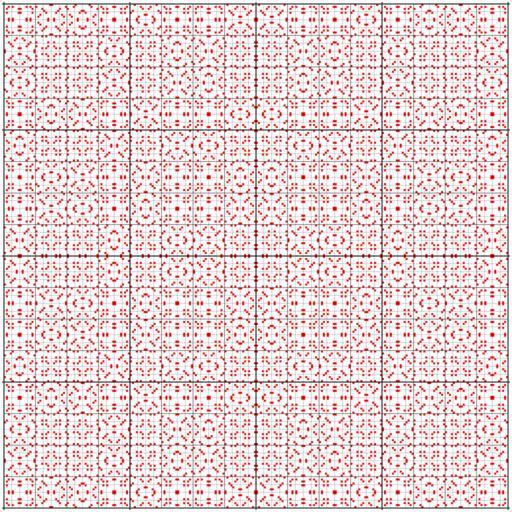 Keywords: 4-ary Boolean functions; matrix wec E3.svg Walsh equivalence class E3 of 4-ary Boolean functions<br> The functions are represented as red squares in a 256×256 matrix organized like a 16-cube Hasse diagram Inkscape-hand a -Boolean Bin2svg own 2012 Mate2code 4-ary Boolean functions; matrix wec |