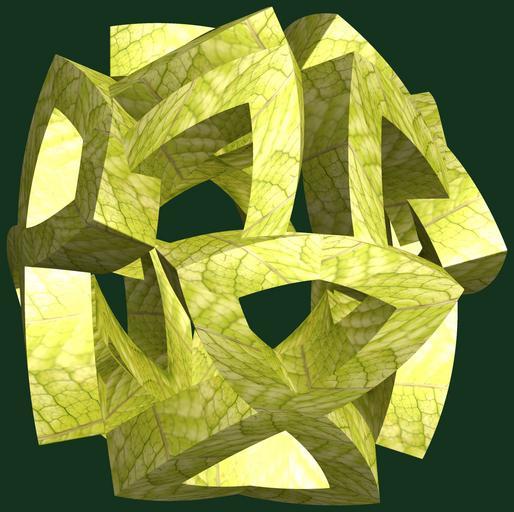 | Keywords: mathematica 3d cg parametricplot3d texture torus code program algorithm プログラム コード アルゴリズム 輪環 りんかん ドーナツ どーなつ 六芒星 ろくぼうせい geometric sculpture geometricsculpture shape geometry sculpture mapping テクスチャ マッピング 模様 もよう abstract 抽象 ちゅうしょう アブストラクト design pattern デザイン パターン graphic グラフィック グラフィクス structure 意匠 構造 symmetry 対称性 たいしょうせい シンメトリー 対称 たいしょう foliage plant leaf outdoor a = 4; (* center hole size *) b = 6; (* hexa-torus *) c = -6; (* distance from the center of rotation *) d = 4; (* number of torus *) h = 1; (* height of a torus *) SetOptions[ParametricPlot3D, PlotRange -> Full, Mesh -> None, Boxed -> False, Axes -> False, PlotPoints -> 400, ImageSize -> 3000, Background -> RGBColor[{20, 50, 30}/255], PlotStyle -> Directive[Specularity[White, 30], Texture[Import["D:/tmp/71.jpg"]]], TextureCoordinateFunction -> ({#4, #5 Pi} &), Lighting -> "Neutral"]; f[v_] := TriangleWave[{-1, 1}, v/(2 Pi)]; g[v_] := TriangleWave[{-1, 1}, v/(2 Pi) + 1/4]; x = (a - g[t] - f[b s]) Cos[s]; y = (a - g[t] - f[b s]) Sin[s]; z = (a - f[t] - h f[b s]) + c; rm = Table[{x, y, z}.RotationMatrix[2 i Pi/d, {1, 1, 0}], {i, d}]; ParametricPlot3D[rm, {t, 0, 2 Pi}, {s, 0, Pi}] (*--- The Texture *) a = 4; (* center hole size *) b = 6; (* hexa-torus *) c = -6; (* distance from the center of rotation *) d = 4; (* number of torus *) h = 1; (* height of a torus *) SetOptions[ParametricPlot3D, PlotRange -> Full, Mesh -> None, Boxed -> False, Axes -> False, PlotPoints -> 400, ImageSize -> 3000, Background -> RGBColor[{20, 50, 30}/255], PlotStyle -> Directive[Specularity[White, 30], Texture[Import["D:/tmp/71.jpg"]]], TextureCoordinateFunction -> ({#4, #5 Pi} &), Lighting -> "Neutral"]; f[v_] := TriangleWave[{-1, 1}, v/(2 Pi)]; g[v_] := TriangleWave[{-1, 1}, v/(2 Pi) + 1/4]; x = (a - g[t] - f[b s]) Cos[s]; y = (a - g[t] - f[b s]) Sin[s]; z = (a - f[t] - h f[b s]) + c; rm = Table[{x, y, z}.RotationMatrix[2 i Pi/d, {1, 1, 0}], {i, d}]; ParametricPlot3D[rm, {t, 0, 2 Pi}, {s, 0, Pi}] (*--- The Texture *) |