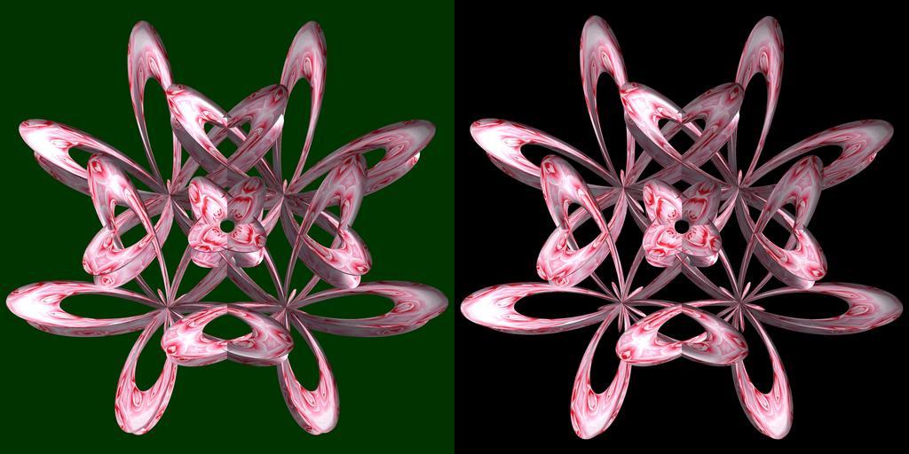 Keywords: mathematica 3d cg parametricplot3d texture torus 輪環 りんかん ドーナツ どーなつ 五芒星 ごぼうせい 五光星 ごこうせい 五稜星 ごりょうせい code program algorithm コード プログラム アルゴリズム pentagram geometric sculpture geometricsculpture shape geometry sculpture mapping テクスチャ マッピング 模様 もよう abstract 抽象 ちゅうしょう アブストラクト design pattern デザイン パターン graphic グラフィック グラフィクス structure 意匠 構造 symmetry 対称性 たいしょうせい シンメトリー 対称 たいしょう algorithm コード black background plant blossom tangle organic pattern flower cluster flower a = 1; (* center hole size of a torus *) b = 5; (* penta-torus *) c = 1; (* distance from the center of rotation *) d = 4; (* number of torus *) h = 1; (* height of a torus *) SetOptions[ParametricPlot3D, PlotRange -> Full, Mesh -> None, Boxed -> False, Axes -> False, PlotPoints -> 400, ImageSize -> 3000, Background -> Darker[Green, 0.8], (* RGBColor[0, 0, 0] *) PlotStyle -> Directive[Specularity[White, 30], Texture[Import["D:/tmp/86.jpg"]]], TextureCoordinateFunction -> ({#4, #5 2 Pi} &), Lighting -> "Neutral"]; f[v_] := Cos[2 Cos[Cos[Cos[v]]]]; x = (a - f[t] - Sin[b s]) Cos[s + 3 Pi/(4 b)] + c; y = (a - f[t] - Sin[b s]) Sin[s + 3 Pi/(4 b)] + c; z = (a - Sin[t/2] - h Sin[b s]); rot = Table[{x, y, z}.RotationMatrix[2 i Pi/d, {0, 0, 1}], {i, d}]; ParametricPlot3D[rot, {t, 0, 2 Pi}, {s, 0, 2 Pi}] (*--- The Texture *) a = 1; (* center hole size of a torus *) b = 5; (* penta-torus *) c = 1; (* distance from the center of rotation *) d = 4; (* number of torus *) h = 1; (* height of a torus *) SetOptions[ParametricPlot3D, PlotRange -> Full, Mesh -> None, Boxed -> False, Axes -> False, PlotPoints -> 400, ImageSize -> 3000, Background -> Darker[Green, 0.8], (* RGBColor[0, 0, 0] *) PlotStyle -> Directive[Specularity[White, 30], Texture[Import["D:/tmp/86.jpg"]]], TextureCoordinateFunction -> ({#4, #5 2 Pi} &), Lighting -> "Neutral"]; f[v_] := Cos[2 Cos[Cos[Cos[v]]]]; x = (a - f[t] - Sin[b s]) Cos[s + 3 Pi/(4 b)] + c; y = (a - f[t] - Sin[b s]) Sin[s + 3 Pi/(4 b)] + c; z = (a - Sin[t/2] - h Sin[b s]); rot = Table[{x, y, z}.RotationMatrix[2 i Pi/d, {0, 0, 1}], {i, d}]; ParametricPlot3D[rot, {t, 0, 2 Pi}, {s, 0, 2 Pi}] (*--- The Texture *) |
