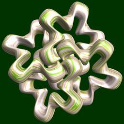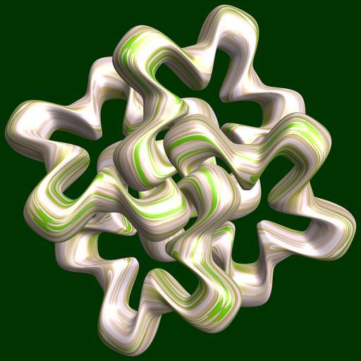 Keywords: mathematica 3d cg parametricplot3d texture torus 輪環 りんかん ドーナツ どーなつ 五芒星 ごぼうせい 五光星 ごこうせい 五稜星 ごりょうせい プログラム コード code program algorithm コード アルゴリズム pentagram geometric sculpture geometricsculpture shape geometry sculpture mapping テクスチャ マッピング 模様 もよう design pattern デザイン パターン graphic グラフィック グラフィクス structure 意匠 構造 symmetry 対称性 たいしょうせい シンメトリー 対称 たいしょう algorithm indoor SetOptions[ParametricPlot3D, PlotRange -> Full, Mesh -> None, Boxed -> False, Axes -> None, PlotPoints -> 300, ImageSize -> 3000, Background -> Darker[Green, 0.8], PlotStyle -> Directive[Specularity[White, 30], Texture[Import["D:/tmp/862.jpg"]]], TextureCoordinateFunction -> ({#4 + #5, #5/Pi} &), Lighting -> "Neutral"]; a = 3; (* center hole size of a torus *) b = 5; (* penta-torus *) c = 3; (* distance from the center of rotation *) d = 4; (* number of torus *) f[v_] := Sin[2 Sin[Sin[Sin[v]]]]; x = (a - Cos[t] - f[b s]) Cos[s + Pi/(2 b)] + c; y = Sin[t] + c; z = (a - Cos[t] - f[b s]) Sin[s + Pi/(2 b)] + c; rot = Table[{x, y, z}.RotationMatrix[2 i Pi/d, {1, 2, 0}], {i, d}]; ParametricPlot3D[rot, {t, 0, 2 Pi}, {s, 0, 2 Pi}] (* --- The Texture *) SetOptions[ParametricPlot3D, PlotRange -> Full, Mesh -> None, Boxed -> False, Axes -> None, PlotPoints -> 300, ImageSize -> 3000, Background -> Darker[Green, 0.8], PlotStyle -> Directive[Specularity[White, 30], Texture[Import["D:/tmp/862.jpg"]]], TextureCoordinateFunction -> ({#4 + #5, #5/Pi} &), Lighting -> "Neutral"]; a = 3; (* center hole size of a torus *) b = 5; (* penta-torus *) c = 3; (* distance from the center of rotation *) d = 4; (* number of torus *) f[v_] := Sin[2 Sin[Sin[Sin[v]]]]; x = (a - Cos[t] - f[b s]) Cos[s + Pi/(2 b)] + c; y = Sin[t] + c; z = (a - Cos[t] - f[b s]) Sin[s + Pi/(2 b)] + c; rot = Table[{x, y, z}.RotationMatrix[2 i Pi/d, {1, 2, 0}], {i, d}]; ParametricPlot3D[rot, {t, 0, 2 Pi}, {s, 0, 2 Pi}] (* --- The Texture *) |