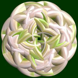 Keywords: mathematica 3d cg parametricplot3d texture torus 輪環 りんかん ドーナツ どーなつ 五芒星 ごぼうせい 五光星 ごこうせい 五稜星 ごりょうせい program プログラム code コード algorithm コード アルゴリズム pentagram geometric sculpture geometricsculpture shape geometry sculpture mapping テクスチャ マッピング 模様 もよう design pattern デザイン パターン graphic グラフィック グラフィクス structure 意匠 構造 symmetry 対称性 たいしょうせい シンメトリー 対称 たいしょう algorithm pastel organic pattern food SetOptions[ParametricPlot3D, PlotRange -> Full, Mesh -> None, Boxed -> False, Axes -> None, PlotPoints -> 400, ImageSize -> 3000, Background -> Darker[Green, 0.8], PlotStyle -> Directive[Specularity[White, 70], Texture[Import["D:/tmp/862.jpg"]]], TextureCoordinateFunction -> ({#4/Pi, #5 /Pi} &), Lighting -> "Neutral"]; a = 3; (* center hole size of a torus *) b = 5; (* penta-torus *) c = 0.7; (* distance from the center of rotation *) d = 4; (* number of torus *) v = 3; w = 1.7; x = (a - Cos[w t] - Sin[b s]) Cos[v s] + c; y = Sin[w t] Cos[b s] + c; z = (a - Cos[w t] - Sin[b s]) Sin[v s] + c; rot = Table[{x, y, z}.RotationMatrix[2 i Pi/d, {0, 1, 0}], {i, d}]; ParametricPlot3D[rot, {t, 0, 2 Pi}, {s, 0, 2 Pi}] (*--- The Texture *) SetOptions[ParametricPlot3D, PlotRange -> Full, Mesh -> None, Boxed -> False, Axes -> None, PlotPoints -> 400, ImageSize -> 3000, Background -> Darker[Green, 0.8], PlotStyle -> Directive[Specularity[White, 70], Texture[Import["D:/tmp/862.jpg"]]], TextureCoordinateFunction -> ({#4/Pi, #5 /Pi} &), Lighting -> "Neutral"]; a = 3; (* center hole size of a torus *) b = 5; (* penta-torus *) c = 0.7; (* distance from the center of rotation *) d = 4; (* number of torus *) v = 3; w = 1.7; x = (a - Cos[w t] - Sin[b s]) Cos[v s] + c; y = Sin[w t] Cos[b s] + c; z = (a - Cos[w t] - Sin[b s]) Sin[v s] + c; rot = Table[{x, y, z}.RotationMatrix[2 i Pi/d, {0, 1, 0}], {i, d}]; ParametricPlot3D[rot, {t, 0, 2 Pi}, {s, 0, 2 Pi}] (*--- The Texture *) |