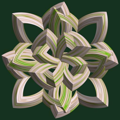 Keywords: mathematica 3d cg parametricplot3d texture torus code program algorithm プログラム コード アルゴリズム 輪環 りんかん ドーナツ どーなつ 五芒星 ごぼうせい geometric sculpture geometricsculpture shape geometry sculpture mapping テクスチャ マッピング 模様 もよう abstract 抽象 ちゅうしょう アブストラクト design pattern デザイン パターン graphic グラフィック グラフィクス structure 意匠 構造 symmetry 対称性 たいしょうせい シンメトリー 対称 たいしょう black background organic pattern a = 4; (* center hole size *) b = 5; (* penta-torus *) c = 2; (* distance from the center of rotation *) d = 4; (* number of torus *) h = 2; (* height of a torus *) SetOptions[ParametricPlot3D, PlotRange -> Full, Mesh -> None, Boxed -> False, Axes -> False, PlotPoints -> 400, ImageSize -> 3000, Background -> RGBColor[{20, 50, 30}/255], PlotStyle -> Directive[Specularity[White, 70], Texture[Import["D:/tmp/862.jpg"]]], TextureCoordinateFunction -> ({#4 + #5, #5 / Pi} &), Lighting -> "Neutral"]; f[v_] := TriangleWave[{-1, 1}, v/(2 Pi)]; g[v_] := TriangleWave[{-1, 1}, v/(2 Pi) + 1/4]; x = (a - g[t] - f[b s]) Cos[s] + c; y = (a - g[t] - f[b s]) Sin[s] + c; z = (a - f[t] - h f[b s]); rm = Table[{x, y, z}.RotationMatrix[2 i Pi/d, {0, 0, 1}], {i, d}]; ParametricPlot3D[rm, {t, 0, 2 Pi}, {s, 0, Pi}] (*--- The Texture *) a = 4; (* center hole size *) b = 5; (* penta-torus *) c = 2; (* distance from the center of rotation *) d = 4; (* number of torus *) h = 2; (* height of a torus *) SetOptions[ParametricPlot3D, PlotRange -> Full, Mesh -> None, Boxed -> False, Axes -> False, PlotPoints -> 400, ImageSize -> 3000, Background -> RGBColor[{20, 50, 30}/255], PlotStyle -> Directive[Specularity[White, 70], Texture[Import["D:/tmp/862.jpg"]]], TextureCoordinateFunction -> ({#4 + #5, #5 / Pi} &), Lighting -> "Neutral"]; f[v_] := TriangleWave[{-1, 1}, v/(2 Pi)]; g[v_] := TriangleWave[{-1, 1}, v/(2 Pi) + 1/4]; x = (a - g[t] - f[b s]) Cos[s] + c; y = (a - g[t] - f[b s]) Sin[s] + c; z = (a - f[t] - h f[b s]); rm = Table[{x, y, z}.RotationMatrix[2 i Pi/d, {0, 0, 1}], {i, d}]; ParametricPlot3D[rm, {t, 0, 2 Pi}, {s, 0, Pi}] (*--- The Texture *) |