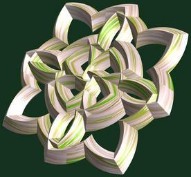 Keywords: mathematica 3d cg parametricplot3d texture torus code program algorithm プログラム コード アルゴリズム 輪環 りんかん ドーナツ どーなつ 五芒星 ごぼうせい geometric sculpture geometricsculpture shape geometry sculpture mapping テクスチャ マッピング 模様 もよう abstract 抽象 ちゅうしょう アブストラクト design pattern デザイン パターン graphic グラフィック グラフィクス structure 意匠 構造 symmetry 対称性 たいしょうせい シンメトリー 対称 たいしょう a = 4; (* center hole size *) b = 5; (* penta-torus *) c = 2; (* distance from the center of rotation *) d = 4; (* number of torus *) h = 0; (* height of a torus *) SetOptions[ParametricPlot3D, PlotRange -> Full, Mesh -> None, Boxed -> False, Axes -> False, PlotPoints -> 400, ImageSize -> 3000, Background -> RGBColor[{20, 50, 30}/255], PlotStyle -> Directive[Specularity[White, 70], Texture[Import["D:/tmp/862.jpg"]]], TextureCoordinateFunction -> ({#4 + #5, #5 / Pi} &), Lighting -> "Neutral"]; f[v_] := TriangleWave[{-1, 1}, v/(2 Pi)]; g[v_] := TriangleWave[{-1, 1}, v/(2 Pi) + 1/4]; x = (a - g[t] - f[b s]) Cos[s] + c; y = (a - g[t] - f[b s]) Sin[s] + c; z = (a - f[t] - h f[b s]); rm = Table[{x, y, z}.RotationMatrix[2 i Pi/d, {0, 0, 1}], {i, d}]; ParametricPlot3D[rm, {t, 0, 2 Pi}, {s, 0, Pi}] (*--- The Texture *) a = 4; (* center hole size *) b = 5; (* penta-torus *) c = 2; (* distance from the center of rotation *) d = 4; (* number of torus *) h = 0; (* height of a torus *) SetOptions[ParametricPlot3D, PlotRange -> Full, Mesh -> None, Boxed -> False, Axes -> False, PlotPoints -> 400, ImageSize -> 3000, Background -> RGBColor[{20, 50, 30}/255], PlotStyle -> Directive[Specularity[White, 70], Texture[Import["D:/tmp/862.jpg"]]], TextureCoordinateFunction -> ({#4 + #5, #5 / Pi} &), Lighting -> "Neutral"]; f[v_] := TriangleWave[{-1, 1}, v/(2 Pi)]; g[v_] := TriangleWave[{-1, 1}, v/(2 Pi) + 1/4]; x = (a - g[t] - f[b s]) Cos[s] + c; y = (a - g[t] - f[b s]) Sin[s] + c; z = (a - f[t] - h f[b s]); rm = Table[{x, y, z}.RotationMatrix[2 i Pi/d, {0, 0, 1}], {i, d}]; ParametricPlot3D[rm, {t, 0, 2 Pi}, {s, 0, Pi}] (*--- The Texture *) |